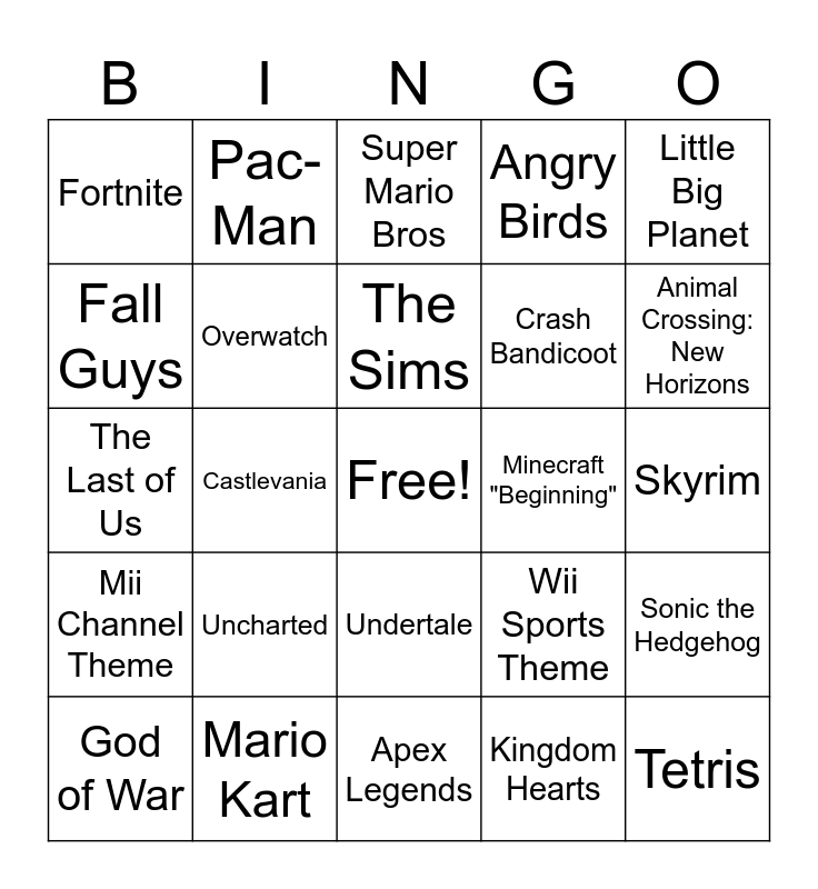 This bingo card has a free space and 27 words: Wii Sports Theme, The Legend of Zelda, Crash Bandicoot, Apex Legends, Fall Guys, Super Mario Bros, Pac-Man, Mii Channel Theme, Minecraft "Beginning", Sonic the Hedgehog, The Last of Us, Angry Birds, God of War, Mario Kart, Animal Crossing: New Horizons, Pokemon Red and Blue, Overwatch, The Sims, Uncharted, Fortnite, Skyrim, Kingdom Hearts, Castlevania, Tetris, Undertale, Little Big Planet and Halo.