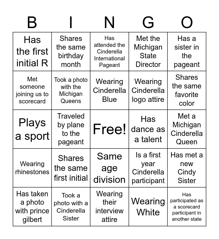 This bingo card has a free space and 24 words: Shares the same first initial, Took a photo with a Cinderella Sister, Wearing Cinderella Blue, Has taken a photo with prince gilbert, Has a sister in the pageant, Has the first initial R, Met someone joining us to scorecard, Shares the same birthday month, Has dance as a talent, Same age division, Wearing Cinderella logo attire, Plays a sport, Is a first year Cinderella participant, Has met a new Cindy Sister, Took a photo with the Michigan Queens, Wearing White, Met a Michigan Cinderella Queen, Has attended the Cinderella International Pageant, Shares the same favorite color, Traveled by plane to the pageant, Has participated as a scorecard participant in another state, Wearing rhinestones, Met the Michigan State Director and Wearing their interview attire.