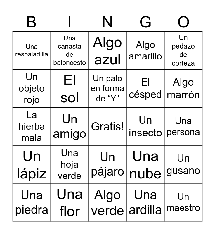 This bingo card has a free space and 24 words: Una hoja verde, Una flor, Un palo en forma de “Y”, Una piedra, Un pedazo de corteza, Una resbaladilla, Un objeto rojo, Una canasta de baloncesto, Un insecto, Un pájaro, El césped, La hierba mala, Una nube, Un gusano, El sol, Una ardilla, Una persona, Algo azul, Algo marrón, Un amigo, Un maestro, Un lápiz, Algo amarillo and Algo verde.