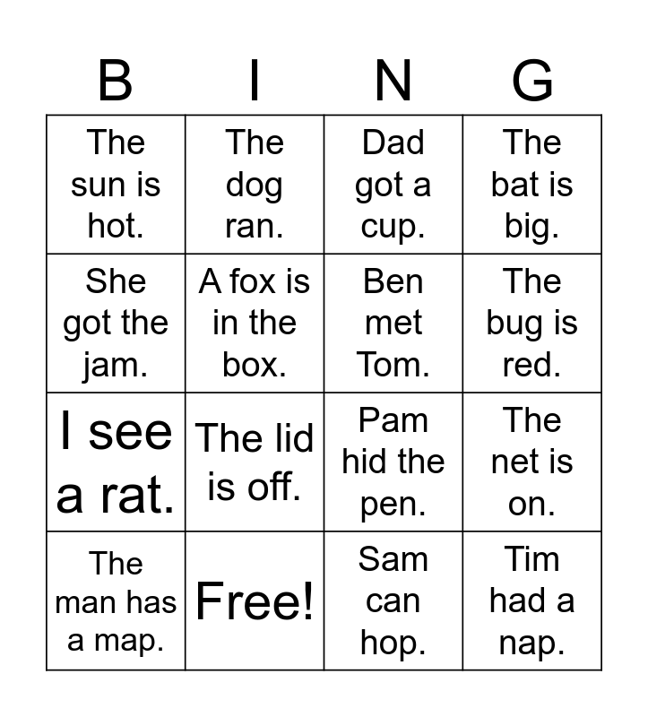 This bingo card has 21 words: Free!, The cat sat., The dog ran., Mom has a hat., Sam can hop., Ben met Tom., The sun is hot., Dad got a cup., Pam hid the pen., The bug is red., I see a rat., The bat is big., Tim had a nap., The pig is wet., A fox is in the box., Ken cut the bun., The man has a map., The lid is off., She got the jam., The net is on. and A bug is on the rug..