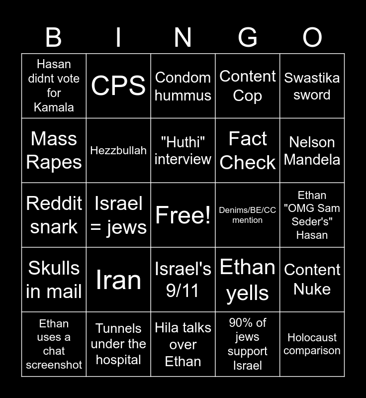 This bingo card has a free space and 27 words: Ethan yells, Hasan yells, Fact Check, Hila talks over Ethan, Mass Rapes, Condom hummus, CPS, Skulls in mail, Denims/BE/CC mention, Content Nuke, Reddit snark, Content Cop, Ethan uses a chat screenshot, Tunnels under the hospital, Nelson Mandela, School protests, Hezzbullah, "Huthi" interview, Iran, Hasan didnt vote for Kamala, Ethan "OMG Sam Seder's" Hasan, 90% of jews support Israel, Israel = jews, Holocaust comparison, Israel's 9/11, Swastika sword and Oct 7th.
