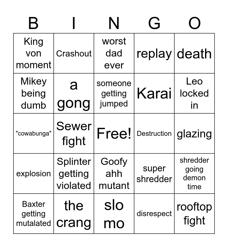 This bingo card has a free space and 24 words: Splinter getting violated, the crang, someone getting jumped, Baxter getting mutalated, death, King von moment, Mikey being dumb, Crashout, Destruction, Goofy ahh mutant, Karai, "cowabunga", super shredder, shredder going demon time, a gong, disrespect, glazing, worst dad ever, Leo locked in, Sewer fight, rooftop fight, explosion, replay and slo mo.