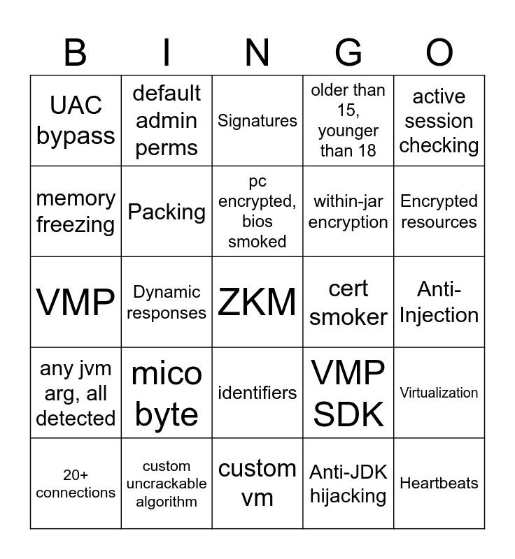 This bingo card has a free space and 24 words: mico byte, custom uncrackable algorithm, pc encrypted, bios smoked, 20+ connections, active session checking, UAC bypass, memory freezing, default admin perms, cert smoker, identifiers, within-jar encryption, VMP, VMP SDK, Virtualization, Packing, Anti-JDK hijacking, Anti-Injection, Signatures, Encrypted resources, Dynamic responses, Heartbeats, any jvm arg, all detected, older than 15, younger than 18 and custom vm.