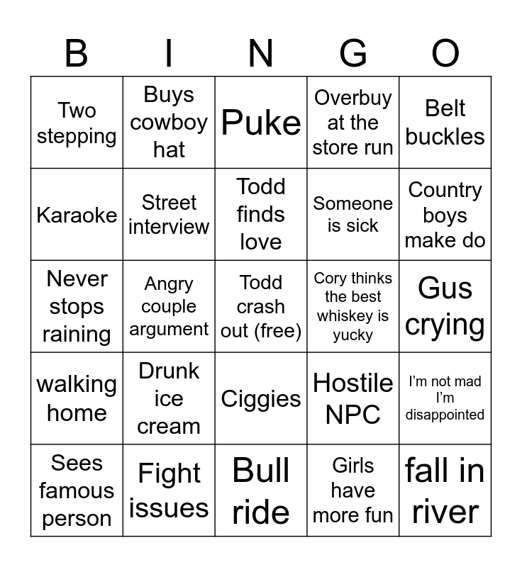 This bingo card has a free space and 24 words: Drunk ice cream, Fight issues, Todd finds love, Sees famous person, Belt buckles, Two stepping, Karaoke, Buys cowboy hat, Cory thinks the best whiskey is yucky, Ciggies, Someone is sick, Never stops raining, Hostile NPC, I’m not mad I’m disappointed, Street interview, Girls have more fun, Gus crying, Puke, Country boys make do, Angry couple argument, fall in river, walking home, Overbuy at the store run and Bull ride.