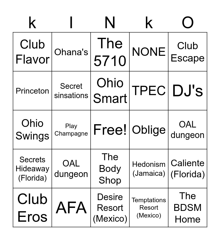 This bingo card has a free space and 24 words: OAL dungeon, AFA, Ohio Smart, Club Eros, Club Escape, Club Flavor, Princeton, Ohana's, Oblige, The Body Shop, TPEC, Ohio Swings, Hedonism (Jamaica), Caliente (Florida), Secret sinsations, Temptations Resort (Mexico), OAL dungeon, The 5710, DJ's, Play Champagne, The BDSM Home, Secrets Hideaway (Florida), NONE and Desire Resort (Mexico).