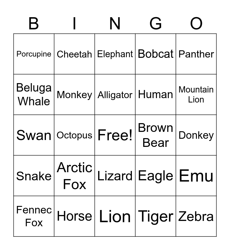 This bingo card has a free space and 29 words: Fennec Fox, Penguin, Octopus, Bee Hummingbird, Porcupine, Elephant, Monkey, Arctic Fox, Brown Bear, Horse, Donkey, Zebra, Lion, Tiger, Mountain Lion, Coyote, Lizard, Snake, Panther, Swan, Eagle, Armadillo, Human, Beluga Whale, Bobcat, Cheetah, Emu, Alligator and Velociraptor.