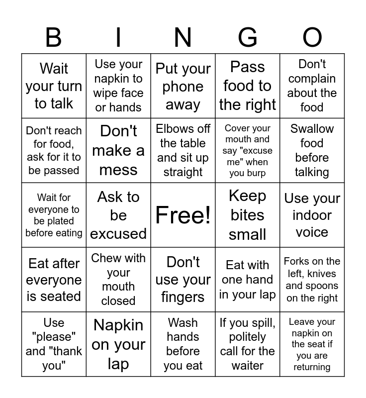 This bingo card has a free space and 24 words: Chew with your mouth closed, Napkin on your lap, Elbows off the table and sit up straight, Use "please" and "thank you", Don't complain about the food, Wait your turn to talk, Don't reach for food, ask for it to be passed, Use your napkin to wipe face or hands, Keep bites small, Don't use your fingers, Cover your mouth and say "excuse me" when you burp, Wait for everyone to be plated before eating, Eat with one hand in your lap, Forks on the left, knives and spoons on the right, Don't make a mess, If you spill, politely call for the waiter, Use your indoor voice, Put your phone away, Swallow food before talking, Ask to be excused, Leave your napkin on the seat if you are returning, Eat after everyone is seated, Pass food to the right and Wash hands before you eat.