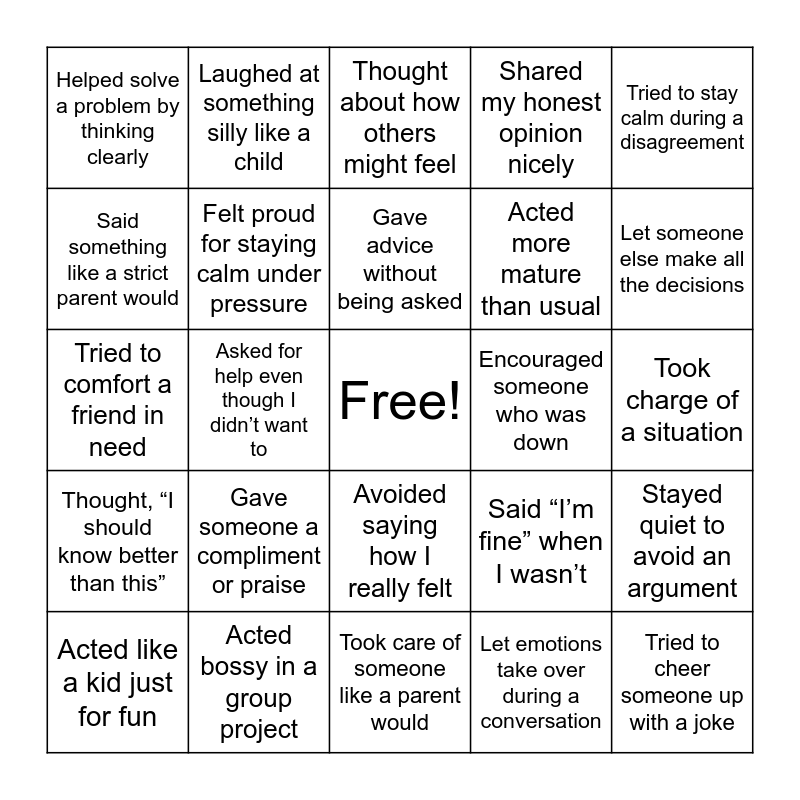 This bingo card has a free space and 24 words: Gave someone a compliment or praise, Acted bossy in a group project, Gave advice without being asked, Acted like a kid just for fun, Tried to stay calm during a disagreement, Helped solve a problem by thinking clearly, Said something like a strict parent would, Laughed at something silly like a child, Encouraged someone who was down, Avoided saying how I really felt, Acted more mature than usual, Tried to comfort a friend in need, Said “I’m fine” when I wasn’t, Stayed quiet to avoid an argument, Felt proud for staying calm under pressure, Let emotions take over during a conversation, Took charge of a situation, Thought about how others might feel, Let someone else make all the decisions, Asked for help even though I didn’t want to, Tried to cheer someone up with a joke, Thought, “I should know better than this”, Shared my honest opinion nicely and Took care of someone like a parent would.