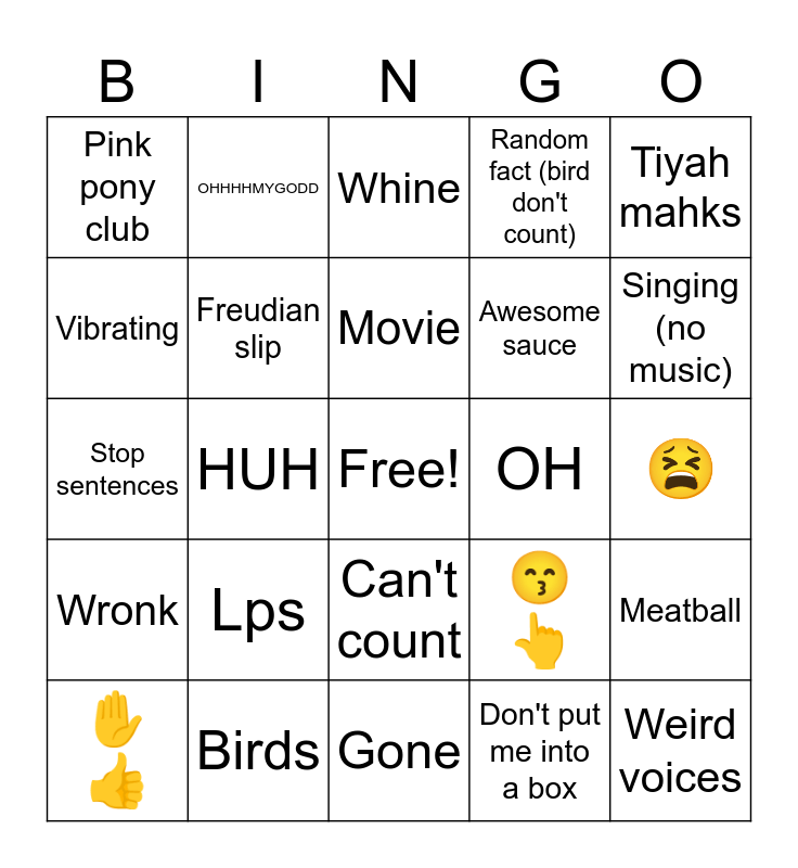 This bingo card has a free space and 24 words: Lps, Birds, Movie, ✋👍, Tiyah mahks, Pink pony club, Vibrating, OHHHHMYGODD, OH, Can't count, Awesome sauce, Stop sentences, 😙👆, Meatball, Freudian slip, Don't put me into a box, 😫, Whine, Singing (no music), HUH, Weird voices, Wronk, Random fact (bird don't count) and Gone.
