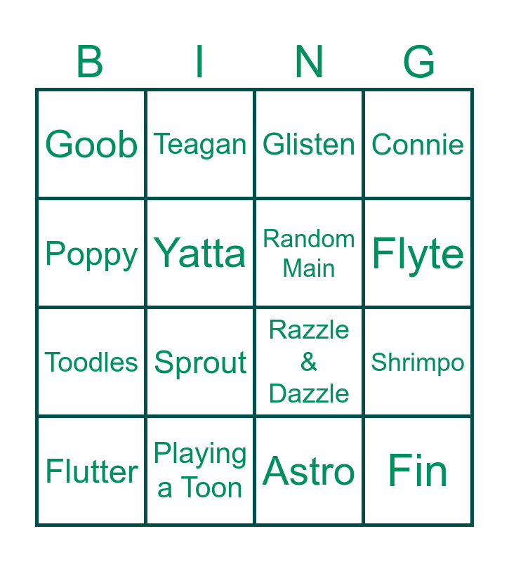 This bingo card has 30 words: Gigi, Box, Shrimpo, Scraps, Goob, Glisten, Random Main, Vee, Playing a Toon, Pebble, Astro, Flutter, Tisha, Shelly, Sprout, Brightney, Cosmo, Fin, Looey, Poppy, Razzle & Dazzle, Rodger, Teagan, Toodles, Yatta, Connie, Bassie, Cocoa, Flyte and Eggson.