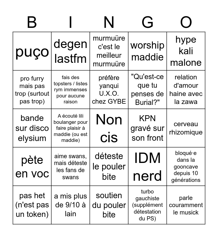 This bingo card has a free space and 24 words: pas het (n'est pas un token), aime swans, mais déteste les fans de swans, préfère yanqui U.X.O. chez GYBE, turbo gauchiste (supplément détestation du PS), hype kali malone, puço, degen lastfm, murmuüre c'est le meilleur murmuüre, KPN gravé sur son front, cerveau rhizomique, bande sur disco elysium, fais des topsters / listes rym immenses pour aucune raison, IDM nerd, bloqué·e dans la gooncave depuis 10 générations, pro furry mais pas trop (surtout pas trop), a mis plus de 9/10 à lain, soutien du pouler bite, worship maddie, relation d'amour haine avec la zawa, pète en voc, A écouté lili boulanger pour faire plaisir à maddie (ou est maddie), déteste le pouler bite, "Qu'est-ce que tu penses de Burial?" and parle couramment le musick.