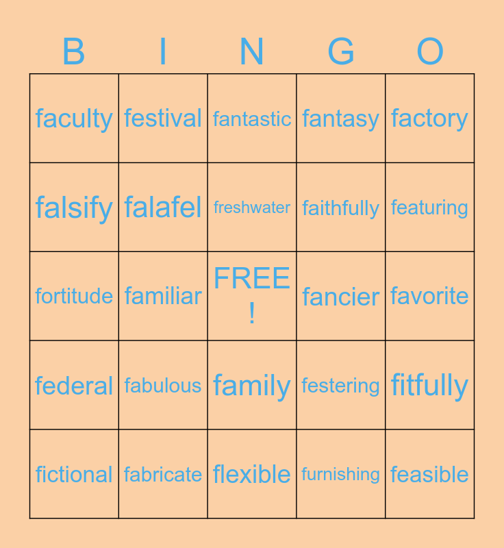 This bingo card has a free space and 24 words: fabulous, fabricate, freshwater, fictional, factory, faculty, falsify, festival, fancier, family, faithfully, fortitude, festering, fitfully, falafel, furnishing, favorite, fantastic, featuring, familiar, feasible, federal, fantasy and flexible.