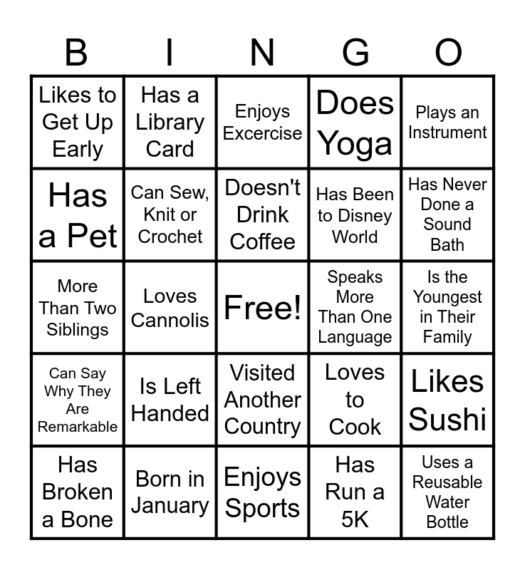 This bingo card has a free space and 24 words: Is Left Handed, Born in January, Doesn't Drink Coffee, Has Broken a Bone, Plays an Instrument, Likes to Get Up Early, Has a Pet, Has a Library Card, Speaks More Than One Language, Visited Another Country, Has Been to Disney World, More Than Two Siblings, Loves to Cook, Likes Sushi, Can Sew, Knit or Crochet, Has Run a 5K, Is the Youngest in Their Family, Enjoys Excercise, Has Never Done a Sound Bath, Loves Cannolis, Uses a Reusable Water Bottle, Can Say Why They Are Remarkable, Does Yoga and Enjoys Sports.