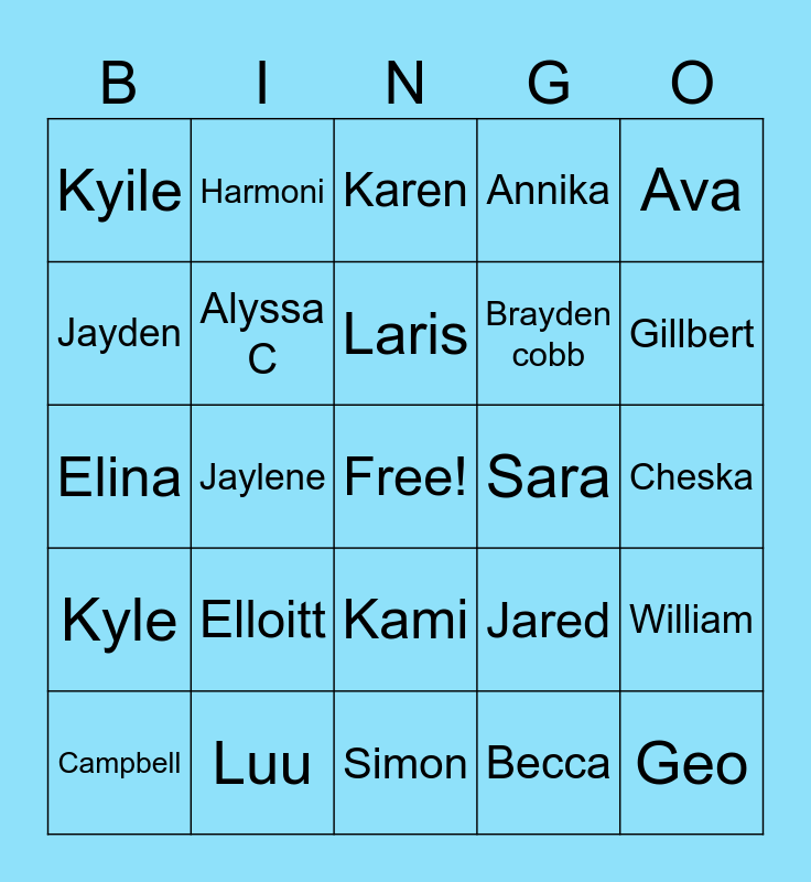 This bingo card has a free space and 24 words: Elloitt, Luu, Laris, Campbell, Ava, Kyile, Jayden, Harmoni, Sara, Kami, Brayden cobb, Elina, Jared, William, Alyssa C, Becca, Cheska, Karen, Gillbert, Jaylene, Geo, Kyle, Annika and Simon.