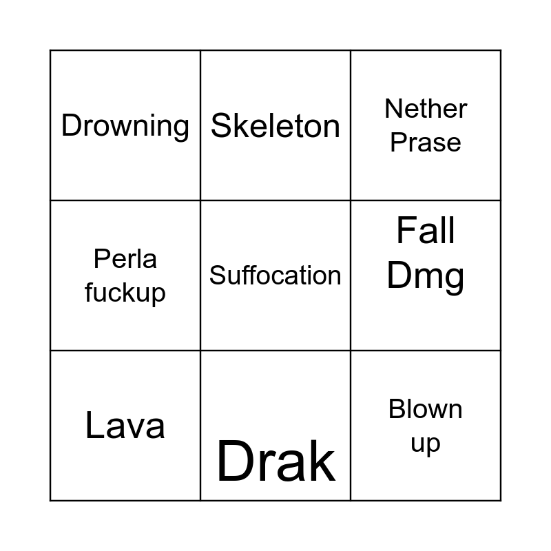 This bingo card has a free space and 8 words: Fall Dmg, Nether Prase, Skeleton, Lava, Drowning, Blown up, Perla fuckup and Drak.