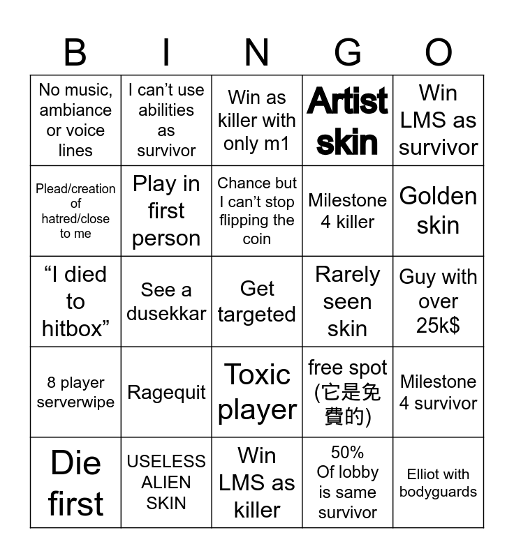 This bingo card has 25 words: Ragequit, Win LMS as killer, Chance but I can’t stop flipping the coin, Die first, Win LMS as survivor, No music, ambiance or voice lines, Plead/creation of hatred/close to me, I can’t use abilities as survivor, Rarely seen skin, Toxic player, Milestone 4 killer, “I died to hitbox”, free spot (它是免費的), Milestone 4 survivor, Play in first person, Elliot with bodyguards, Guy with over 25k$, Win as killer with only m1, Golden skin, See a dusekkar, Get targeted, USELESS ALIEN SKIN, 8 player serverwipe, Artist skin and 50% Of lobby is same survivor.