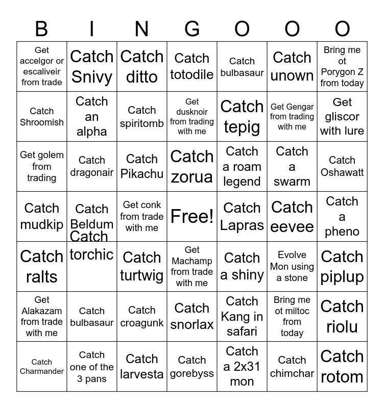 This bingo card has a free space and 48 words: Catch Kang in safari, Get Gengar from trading with me, Catch gorebyss, Catch Beldum, Catch Pikachu, Catch a pheno, Catch Snivy, Catch one of the 3 pans, Catch unown, Get Machamp from trade with me, Bring me ot Porygon Z from today, Catch totodile, Catch a swarm, Catch a roam legend, Get Alakazam from trade with me, Catch eevee, Catch Shroomish, Get gliscor with lure, Bring me ot miltoc from today, Catch bulbasaur, Catch tepig, Get conk from trade with me, Get accelgor or escaliveir from trade, Catch an alpha, Catch riolu, Catch spiritomb, Catch Oshawatt, Catch Charmander, Catch zorua, Catch dragonair, Catch chimchar, Catch Lapras, Catch piplup, Catch bulbasaur, Catch mudkip, Catch a shiny, Evolve Mon using a stone, Get golem from trading, Catch turtwig, Catch croagunk, Catch ralts, Catch rotom, Catch ditto, Catch larvesta, Get dusknoir from trading with me, Catch snorlax, Catch torchic and Catch a 2x31 mon.