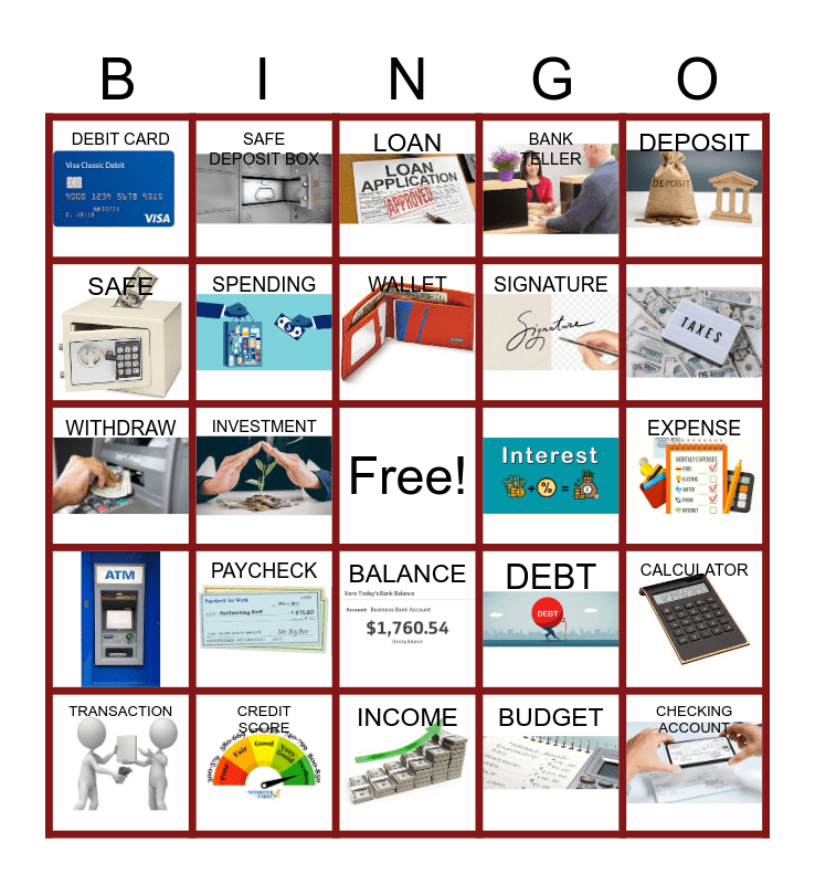 This bingo card has 29 images, a free space and 25 words: TRANSACTION, SAVINGS, INVESTMENT, CREDIT CARD, DEBIT CARD, LOAN, SPENDING, PAYCHECK, CREDIT SCORE, EXPENSE, CHECKING ACCOUNT, INCOME, BUDGET, BANK STATEMENT, BALANCE, DEPOSIT, WITHDRAW, DEBT, RECIEPT, SIGNATURE, SAFE, BANK TELLER, SAFE DEPOSIT BOX, CALCULATOR and WALLET.