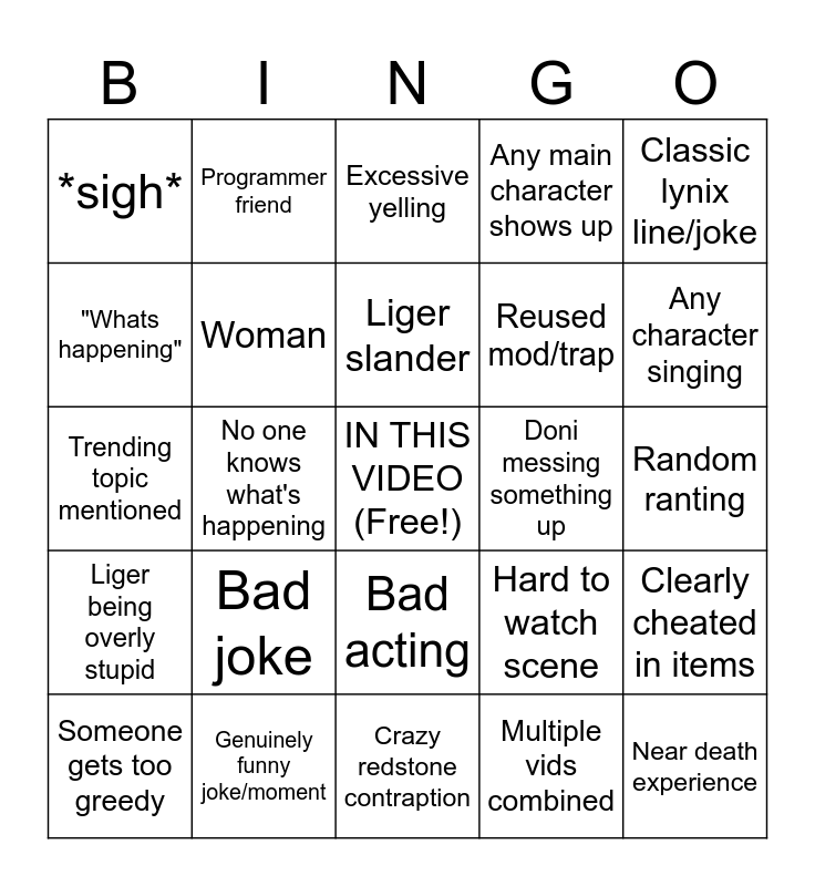 This bingo card has a free space and 34 words: Unrealistic scenario, Multiple vids combined, Title doesn't Mach vid, never mentioned before side character, Liger being overly stupid, Woman, Classic lynix line/joke, Someone gets too greedy, Programmer friend, Op weapon, Liger slander, Excessive yelling, Someone being (kinda) smart, A trap/mod fails, Doni messing something up, Any character singing, Genuinely funny joke/moment, Trending topic mentioned, Bad joke, Hard to watch scene, Bad acting, Fake laugh, *sigh*, Random ranting, Crazy redstone contraption, Near death experience, Any main character shows up, Family friendly, Reused mod/trap, "Whats happening", Sexual joke, No one knows what's happening, Clearly cheated in items and Rage is suspicious.