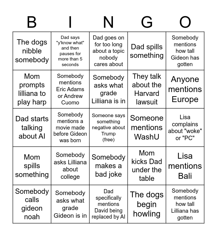 This bingo card has a free space and 24 words: Somebody asks Lilliana about college, Somebody asks what grade Gideon is in, Somebody asks what grade Lilliana is in, Somebody calls gideon noah, Somebody mentions how tall Gideon has gotten, The dogs nibble somebody, Mom prompts lilliana to play harp, Dad says "y'know what" and then pauses for more than 5 seconds, Someone mentions WashU, Somebody makes a bad joke, They talk about the Harvard lawsuit, Dad starts talking about AI, Mom kicks Dad under the table, Lisa mentions Bali, Somebody mentions Eric Adams or Andrew Cuomo, The dogs begin howling, Lisa complains about "woke" or "PC", Dad goes on for too long about a topic nobody cares about, Anyone mentions Europe, Somebody mentions a movie made before Gideon was born, Somebody mentions how tall Lilliana has gotten, Mom spills something, Dad spills something and Dad specifically mentions David being replaced by AI.