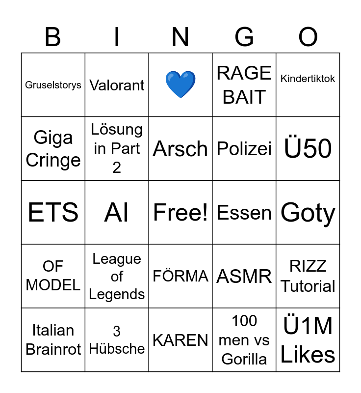 This bingo card has a free space and 24 words: League of Legends, 3 Hübsche, Arsch, Italian Brainrot, Kindertiktok, Gruselstorys, Giga Cringe, Valorant, Essen, FÖRMA, Polizei, ETS, ASMR, RIZZ Tutorial, Lösung in Part 2, 100 men vs Gorilla, Goty, 💙, Ü50, AI, Ü1M Likes, OF MODEL, RAGE BAIT and KAREN.
