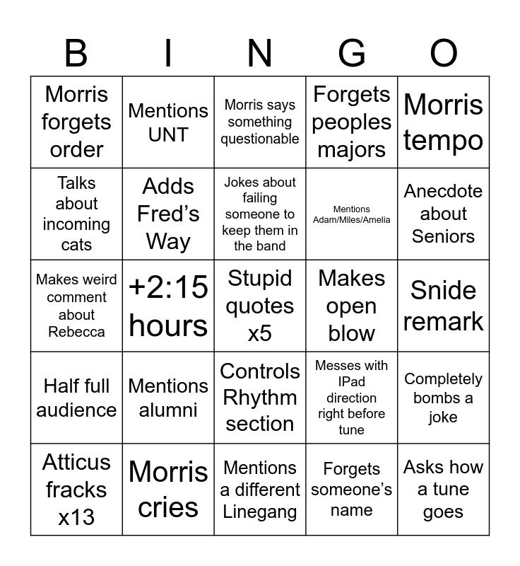 This bingo card has 30 words: Morris cries, Morris Yaps, +2:15 hours, Morris calls face first something wrong, Morris forgets order, Morris says something questionable, Adds Fred’s Way, Controls Rhythm section, Makes open blow, Mentions a different Linegang, Snide remark, Stupid quotes x5, Forgets someone’s name, Asks how a tune goes, Anecdote about Seniors, Talks about Ben Patterson, Messes with IPad direction right before tune, Half full audience, Mentions alumni, Morris tempo, Makes weird comment about Rebecca, Talks about Oakwood high school, Mentions UNT, Mentions Adam/Miles/Amelia, Talks about incoming cats, Forgets peoples majors, Completely bombs a joke, Atticus fracks x13, Jokes about failing someone to keep them in the band and Morris F’s up a blow section.