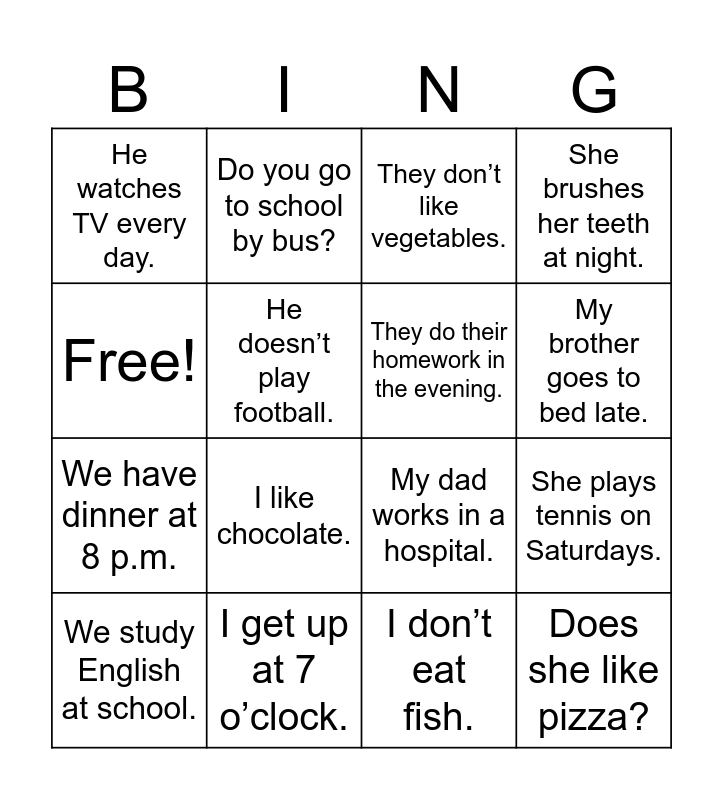This bingo card has 16 words: I get up at 7 o’clock., She plays tennis on Saturdays., They don’t like vegetables., He watches TV every day., We have dinner at 8 p.m., Do you go to school by bus?, My dad works in a hospital., I don’t eat fish., Free!, He doesn’t play football., We study English at school., She brushes her teeth at night., I like chocolate., My brother goes to bed late., They do their homework in the evening. and Does she like pizza?.