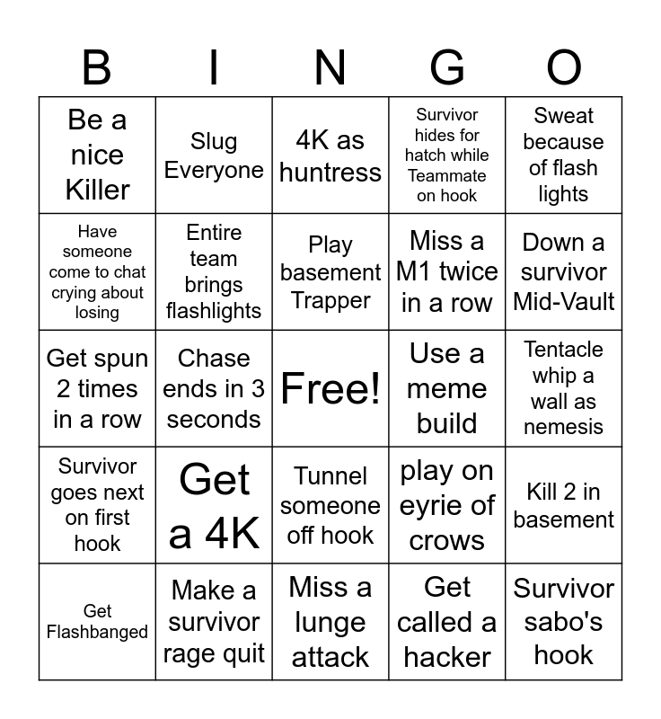 This bingo card has a free space and 24 words: Get a 4K, Make a survivor rage quit, Play basement Trapper, Get Flashbanged, Sweat because of flash lights, Be a nice Killer, Have someone come to chat crying about losing, Slug Everyone, Use a meme build, Tunnel someone off hook, Miss a M1 twice in a row, Get spun 2 times in a row, play on eyrie of crows, Kill 2 in basement, Entire team brings flashlights, Get called a hacker, Tentacle whip a wall as nemesis, 4K as huntress, Down a survivor Mid-Vault, Chase ends in 3 seconds, Survivor sabo's hook, Survivor goes next on first hook, Survivor hides for hatch while Teammate on hook and Miss a lunge attack.