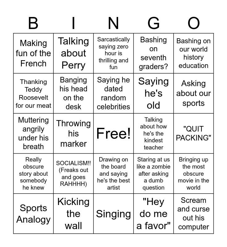 This bingo card has a free space and 29 words: Sports Analogy, Fake German, Throwing his marker, Surprised when we show emotion, Making fun of the French, Sarcastically saying zero hour is thrilling and fun, Banging his head on the desk, SOCIALISM!! (Freaks out and goes RAHHHH), Talking about how he's the kindest teacher, Kicking the wall, "QUIT PACKING", Scream and curse out his computer, Singing, "Hey do me a favor", Asking about our sports, Talking about his wife hating history, Drawing on the board and saying he's the best artist, Really obscure story about somebody he knew, Bashing on our world history education, Muttering angrily under his breath, Staring at us like a zombie after asking a dumb question, Laughing before even saying the joke, Saying he's old, Thanking Teddy Roosevelt for our meat, Bashing on seventh graders?, Talking about Perry, Bringing up the most obscure movie in the world, Saying he dated random celebrities and Quizzing us on college sport mascots.