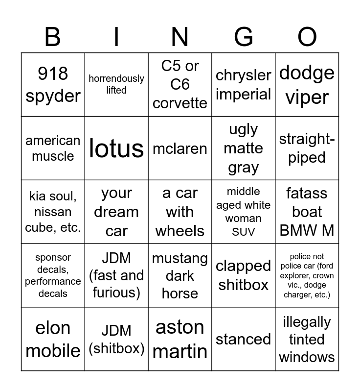 This bingo card has a free space and 24 words: JDM (fast and furious), JDM (shitbox), mclaren, elon mobile, dodge viper, 918 spyder, american muscle, horrendously lifted, middle aged white woman SUV, mustang dark horse, ugly matte gray, kia soul, nissan cube, etc., clapped shitbox, police not police car (ford explorer, crown vic., dodge charger, etc.), lotus, stanced, fatass boat BMW M, C5 or C6 corvette, straight-piped, your dream car, illegally tinted windows, sponsor decals, performance decals, chrysler imperial and aston martin.