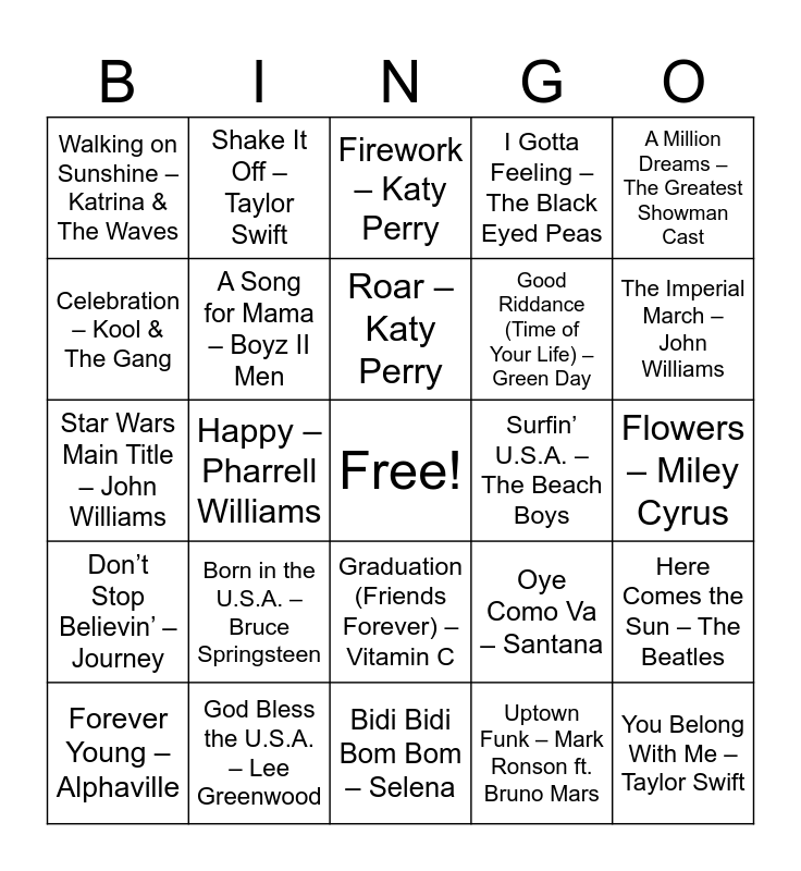 This bingo card has a free space and 30 words: God Bless the U.S.A. – Lee Greenwood, Space Oddity – David Bowie, Happy – Pharrell Williams, The Best Day – Taylor Swift, Walking on Sunshine – Katrina & The Waves, Firework – Katy Perry, A Song for Mama – Boyz II Men, Graduation (Friends Forever) – Vitamin C, Surfin’ U.S.A. – The Beach Boys, Bidi Bidi Bom Bom – Selena, Flowers – Miley Cyrus, You Belong With Me – Taylor Swift, Uptown Funk – Mark Ronson ft. Bruno Mars, Living in America – James Brown, The Imperial March – John Williams, Mama Said – The Shirelles, Oye Como Va – Santana, Don’t Stop Believin’ – Journey, Born in the U.S.A. – Bruce Springsteen, A Million Dreams – The Greatest Showman Cast, Star Wars Main Title – John Williams, We Are Family – Sister Sledge, Shake It Off – Taylor Swift, Good Riddance (Time of Your Life) – Green Day, Celebration – Kool & The Gang, I Gotta Feeling – The Black Eyed Peas, Here Comes the Sun – The Beatles, Forever Young – Alphaville, Roar – Katy Perry and La Bamba – Ritchie Valens.