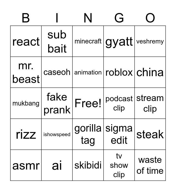 This bingo card has a free space and 24 words: ishowspeed, ai, animation, asmr, veshremy, react, mr. beast, sub bait, podcast clip, gorilla tag, roblox, mukbang, sigma edit, steak, caseoh, tv show clip, stream clip, minecraft, china, fake prank, waste of time, rizz, gyatt and skibidi.