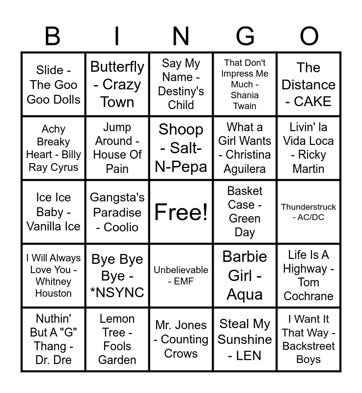 This bingo card has a free space and 100 words: Macarena - Los Del Rio, Tubthumping - Chumbawamba, Thunderstruck - AC/DC, Wonderwall - Oasis, Vogue - Madonna, Pretty Fly - The Offspring, Smells Like Teen Spirit - Nirvana, Informer - Snow, Someday - Sugar Ray, You Gotta Be - Des'ree, Candle In The Wind - Elton John, Boom Boom Boom Boom!! - Vengaboys, Two Princes - Spin Doctors, Lemon Tree - Fools Garden, Pump Up The Jam - Technotronic, Blue - Eiffel 65, What a Girl Wants - Christina Aguilera, Black Velvet - Alannah Myles, ...Baby One More Time - Britney Spears, The Impression That I Get - The Mighty Mighty Bosstones, The Sign - Ace of Base, It's All Coming Back to Me Now - Céline Dion, Who Will Save Your Soul - Jewel, All I Wanna Do - Sheryl Crow, Kiss from a Rose - Seal, Basket Case - Green Day, The Distance - CAKE, Barbie Girl - Aqua, Just A Girl - No Doubt, Something To Talk About - Bonnie Raitt, Gangsta's Paradise - Coolio, Slide - The Goo Goo Dolls, No Scrubs - TLC, Gettin' Jiggy Wit It - Will Smith, Steal My Sunshine - LEN, Shoop - Salt-N-Pepa, Life Is A Highway - Tom Cochrane, Hand in my Pocket - Alanis Morissette, Give It Away - Red Hot Chili Peppers, All For Love - Bryan Adams, I'm Gonna Be - The Proclaimers, Everlong - Foo Fighters, Ice Ice Baby - Vanilla Ice, Sweetness - Jimmy Eat World, Livin' la Vida Loca - Ricky Martin, Say My Name - Destiny's Child, She’s So High - Tal Bachman, Fly Away - Lenny Kravitz, Believe - Cher, Mr. Jones - Counting Crows, End Of The Road - Boyz II Men, Shine - Collective Soul, With Arms Wide Open - Creed, Linger - The Cranberries, Gonna Make You Sweat - C & C Music Factory, Gin And Juice - Snoop Dogg, S Club Party - S Club, Whoomp! There It Is - Tag Team, Jump - Kris Kross, That Don't Impress Me Much - Shania Twain, How Bizarre - OMC, One Week - Barenaked Ladies, No Rain - Blind Melon, Say You'll Be There - Spice Girls, U Can't Touch This - MC Hammer, My Lovin' - En Vogue, Bad Boys - Inner Circle, ЗАМ - Matchbox Twenty, Return of the Mack - Mark Morrison, I’d Do Anything For Love - Meat Loaf, Sell Out - Reel Big Fish, Bye Bye Bye - *NSYNC, Baby Baby - Amy Grant, Boombastic - Shaggy, Mr. Vain - Culture Beat, Emotions - Mariah Carey, Mambo No. 5 - Lou Bega, Achy Breaky Heart - Billy Ray Cyrus, Free Fallin' - Tom Petty, Losing My Religion - R.E.M., Insane in the Brain - Cypress Hill, I Want It That Way - Backstreet Boys, Closing Time - Semisonic, Unbelievable - EMF, I Want You - Savage Garden, Butterfly - Crazy Town, Baby Got Back - Sir Mix-A-Lot, The Lion Sleeps Tonight - The Tokens, I'm Too Sexy - Right Said Fred, I Will Always Love You - Whitney Houston, This Is How We Do It - Montell Jordan, The Show Must Go On - Queen, What Is Love - Haddaway, Nuthin' But A "G" Thang - Dr. Dre, Jump Around - House Of Pain, When I'm Up I Can't Get Down - Great Big Sea, Will You Be There - Michael Jackson, Semi-Charmed Life -Third Eye Blind, 1979 - The Smashing Pumpkins and Creep - Radiohead.