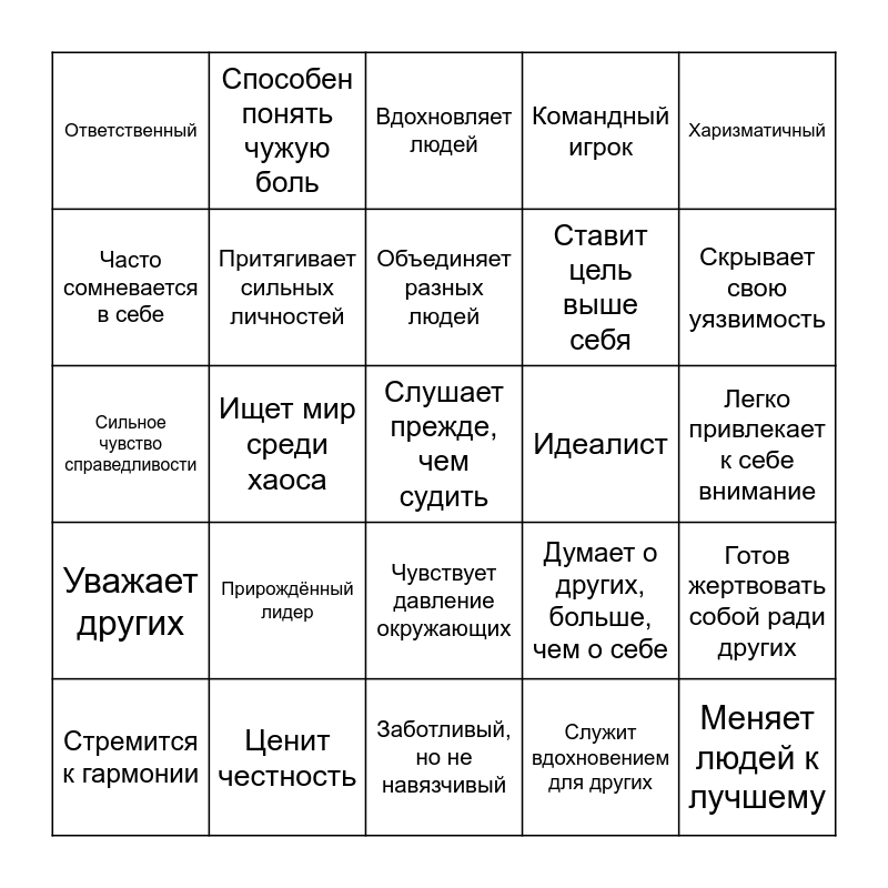 This bingo card has 25 words: Прирождённый лидер, Заботливый, но не навязчивый, Объединяет разных людей, Стремится к гармонии, Харизматичный, Ответственный, Часто сомневается в себе, Способен понять чужую боль, Идеалист, Чувствует давление окружающих, Ставит цель выше себя, Сильное чувство справедливости, Думает о других, больше, чем о себе, Готов жертвовать собой ради других, Притягивает сильных личностей, Меняет людей к лучшему, Легко привлекает к себе внимание, Вдохновляет людей, Скрывает свою уязвимость, Ищет мир среди хаоса, Слушает прежде, чем судить, Ценит честность, Уважает других, Командный игрок and Служит вдохновением для других.