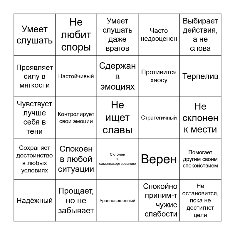 This bingo card has 25 words: Спокоен в любой ситуации, Уравновешенный, Сдержан в эмоциях, Надёжный, Выбирает действия, а не слова, Умеет слушать, Проявляет силу в мягкости, Не любит споры, Стратегичный, Склонен К самопожертвованию, Противится хаосу, Чувствует лучше себя в тени, Верен, Помогает другим своим спокойствием, Настойчивый, Не остановится, пока не достигнет цели, Не склонен к мести, Умеет слушать даже врагов, Терпелив, Контролирует свои эмоции, Не ищет славы, Прощает, но не забывает, Сохраняет достоинство в любых условиях, Часто недооценен and Спокойно приним-т чужие слабости.