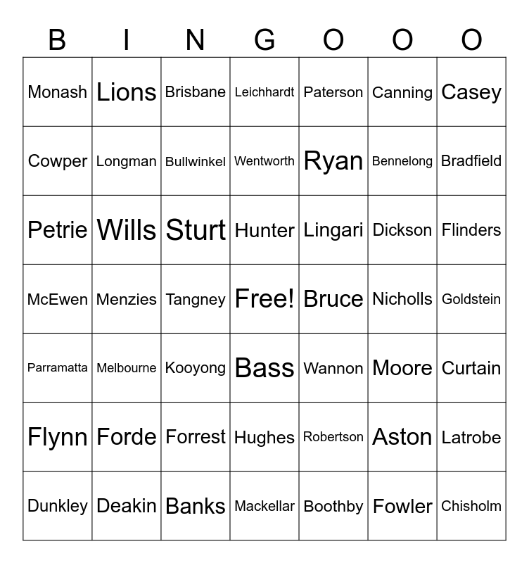 This bingo card has a free space and 52 words: Deakin, Bennelong, Gilmore, Menzies, Sturt, Moore, Lions, Fowler, Canning, Curtain, Casey, Bass, Dickson, Lingari, Robertson, Kooyong, Cowper, Bradfield, Banks, Paterson, Ryan, Tangney, Monash, Longman, Mackellar, Chisholm, Goldstein, Boothby, Bullwinkel, Nicholls, Bonnie, Leichhardt, Hughes, Aston, Parramatta, Brisbane, McEwen, Wannon, Flynn, Forde, Forrest, Petrie, Wills, Durack, Hunter, Bruce, Melbourne, Wentworth, Latrobe, Dunkley, Flinders and Griffith.