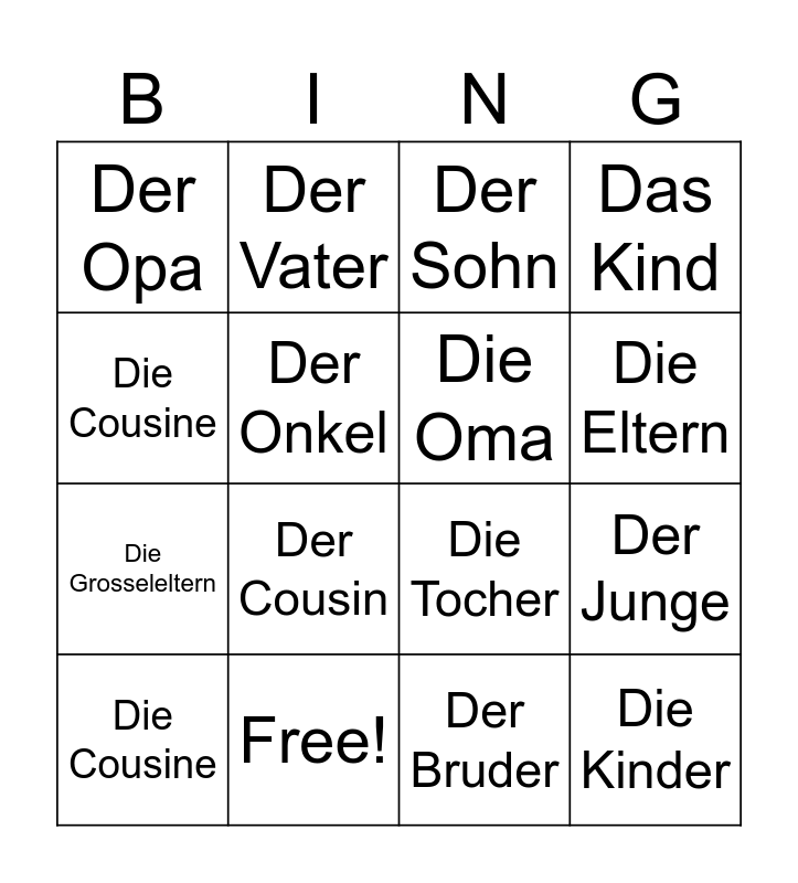 This bingo card has 21 words: Free!, Die Mutter, Der Vater, Die Schwester, Der Bruder, Die Oma, Der Opa, Der Sohn, Die Tocher, Die Eltern, Die Grosseleltern, Das Kind, Die Kinder, Die Tante, Der Onkel, Das Baby, Die Cousine, Der Cousin, Die Cousine, Der Junge and Das Mädchen.