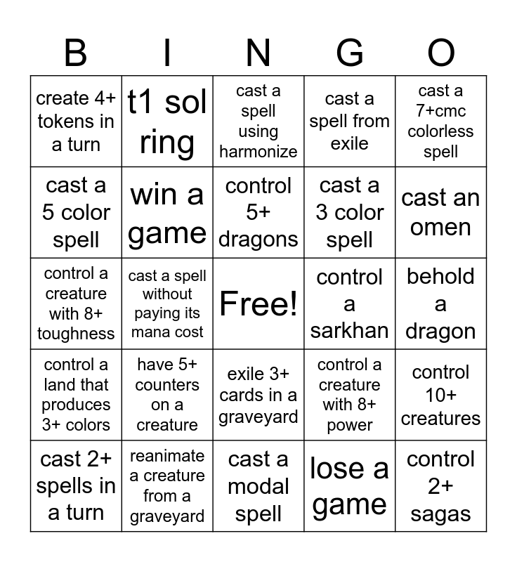 This bingo card has a free space and 24 words: have 5+ counters on a creature, reanimate a creature from a graveyard, control 5+ dragons, cast 2+ spells in a turn, cast a 7+cmc colorless spell, create 4+ tokens in a turn, cast a 5 color spell, t1 sol ring, control a sarkhan, exile 3+ cards in a graveyard, cast a 3 color spell, control a creature with 8+ toughness, control a creature with 8+ power, control 10+ creatures, win a game, lose a game, behold a dragon, cast a spell using harmonize, cast an omen, cast a spell without paying its mana cost, control 2+ sagas, control a land that produces 3+ colors, cast a spell from exile and cast a modal spell.