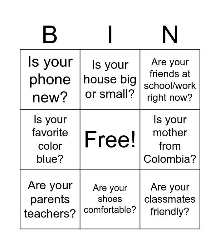 This bingo card has a free space and 8 words: Is your mother from Colombia?, Are your friends at school/work right now?, Is your house big or small?, Are your parents teachers?, Is your phone new?, Are your classmates friendly?, Is your favorite color blue? and Are your shoes comfortable?.