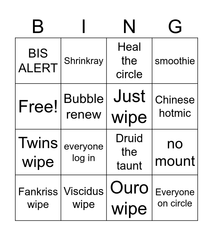 This bingo card has 16 words: Viscidus wipe, no mount, Heal the circle, BIS ALERT, Twins wipe, Shrinkray, Druid the taunt, Ouro wipe, Free!, Bubble renew, Fankriss wipe, smoothie, everyone log in, Chinese hotmic, Just wipe and Everyone on circle.