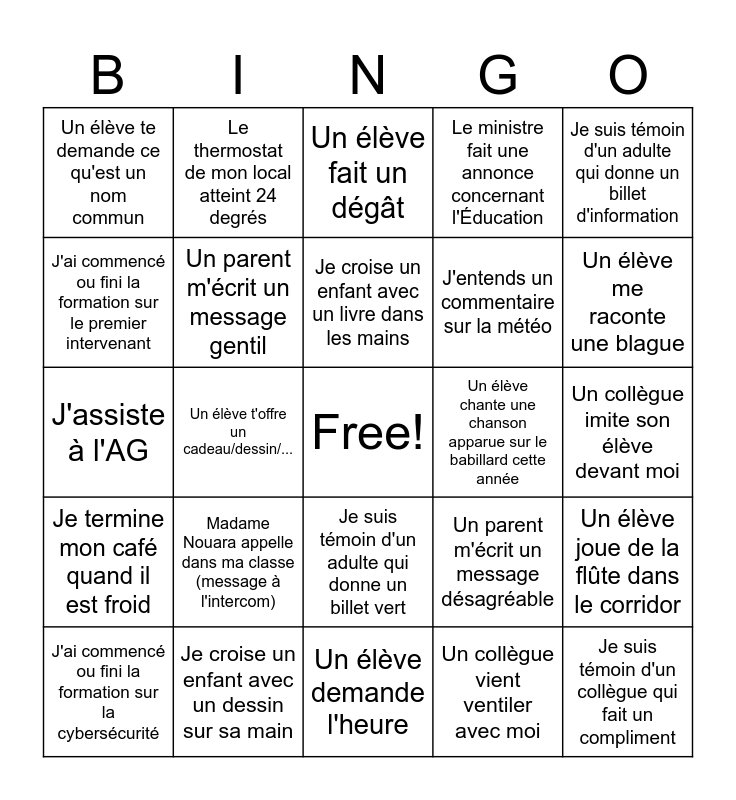 This bingo card has a free space and 31 words: Un élève demande l'heure, Un élève te fait sentir vieux/vieille, Un élève t'offre un cadeau/dessin/..., Mon groupe réussi un déplacement en silence, Un élève te demande ce qu'est un nom commun, Un élève fait un dégât, Un parent m'écrit un message gentil, Un parent m'écrit un message désagréable, Un élève chante une chanson apparue sur le babillard cette année, Un collègue vient ventiler avec moi, Un collègue imite son élève devant moi, Je suis témoin d'un collègue qui fait un compliment, Un élève parle de son animal de compagnie, Un élève parle sans lever la main, Un élève me raconte une blague, Le photocopieur a un dysfonctionnement imprévu, Un élève joue de la flûte dans le corridor, Madame Nouara appelle dans ma classe (message à l'intercom), Je termine mon café quand il est froid, Je suis témoin d'un adulte qui donne un billet vert, Je suis témoin d'un adulte qui donne un billet d'information, Un élève me fait un câlin, J'ai commencé ou fini la formation sur la cybersécurité, Le thermostat de mon local atteint 24 degrés, J'entends un commentaire sur la météo, J'ai commencé ou fini la formation sur le premier intervenant, Le ministre fait une annonce concernant l'Éducation, J'assiste à l'AG, Je croise un enfant avec un dessin sur sa main, Je croise un enfant avec un livre dans les mains and C'est l'anniversaire de quelqu'un à l'école.