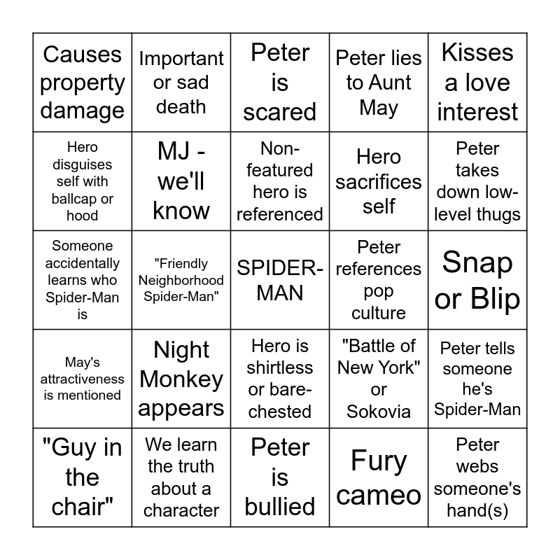 This bingo card has a free space and 26 words: Hero is shirtless or bare-chested, Fury cameo, Non-featured hero is referenced, We learn the truth about a character, Kisses a love interest, Causes property damage, Hero disguises self with ballcap or hood, Important or sad death, Snap or Blip, "Battle of New York" or Sokovia, Hero sacrifices self, Someone accidentally learns who Spider-Man is, Peter tells someone he's Spider-Man, "Guy in the chair", "Friendly Neighborhood Spider-Man", Happy scolds Peter, Peter lies to Aunt May, May's attractiveness is mentioned, Peter is scared, Peter webs someone's hand(s), Peter takes down low-level thugs, Peter is bullied, Peter references pop culture, Night Monkey appears, MJ - we'll know and Villain - we'll know.