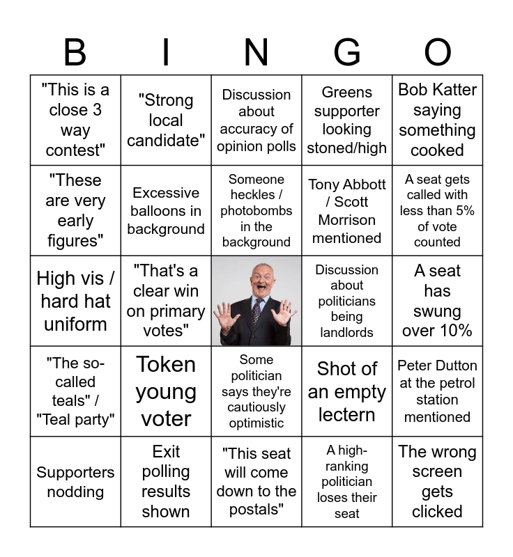 This bingo card has a free space and 39 words: Trumpet of patriots joke, Democracy sausage, A member of the Hanson family appears, Excessive balloons in background, Supporters nodding, Some politician says they're cautiously optimistic, Someone heckles / photobombs in the background, Someone wears / speaks some MAGA stuff, Bob Katter saying something cooked, "The so-called teals" / "Teal party", "That's a clear win on primary votes", Greens supporter looking stoned/high, The wrong screen gets clicked, A seat has swung over 10%, Discussion about politicians being landlords, Token young voter, An independent / green flips a seat, "This is a close 3 way contest", Discussion on Peter Dutton's seat, Shot of an empty lectern, "These are very early figures", "This seat will come down to the postals", Tony Abbott / Scott Morrison mentioned, A seat gets called with less than 5% of vote counted, A candidate gets drowned out by noise in the background, Discussion about influencers / memes, Discussion about preference dealings, Candidate refuses to concede, Hung parliament is mentioned, "Strong local candidate", "Canberra bubble", Polling booth closes late, Discussion about accuracy of opinion polls, Exit polling results shown, A high-ranking politician loses their seat, Anthony Albanese falling off stage mentioned, Peter Dutton at the petrol station mentioned, High vis / hard hat uniform and Someone forgetting the dress code at a party HQ.