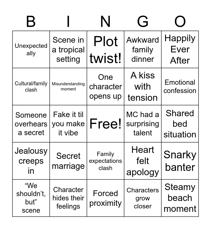 This bingo card has a free space and 24 words: Secret marriage, Character hides their feelings, One character opens up, “We shouldn’t, but” scene, Happily Ever After, Unexpected ally, Cultural/family clash, Scene in a tropical setting, MC had a surprising talent, Family expectations clash, A kiss with tension, Someone overhears a secret, Heart felt apology, Snarky banter, Misunderstanding moment, Characters grow closer, Shared bed situation, Plot twist!, Emotional confession, Fake it til you make it vibe, Steamy beach moment, Jealousy creeps in, Awkward family dinner and Forced proximity.
