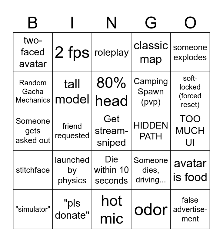 This bingo card has a free space and 24 words: launched by physics, "pls donate", 80% head, "simulator", someone explodes, two-faced avatar, Random Gacha Mechanics, 2 fps, HIDDEN PATH, Die within 10 seconds, Camping Spawn (pvp), Someone gets asked out, Someone dies, driving..., avatar is food, tall model, odor, TOO MUCH UI, roleplay, soft-locked (forced reset), friend requested, false advertise-ment, stitchface, classic map and hot mic.