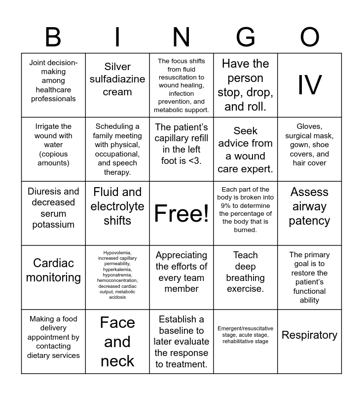 This bingo card has a free space and 30 words: Face and neck, Lund-Browder Chart, Fluid and electrolyte shifts, Thermal, Joint decision-making among healthcare professionals, The focus shifts from fluid resuscitation to wound healing, infection prevention, and metabolic support., Scheduling a family meeting with physical, occupational, and speech therapy., Appreciating the efforts of every team member, Each part of the body is broken into 9% to determine the percentage of the body that is burned., Establish a baseline to later evaluate the response to treatment., Assess airway patency, Respiratory, Emergent/resuscitative stage, acute stage, rehabilitative stage, Requesting resources from the case manager and social worker, Gloves, surgical mask, gown, shoe covers, and hair cover, Remove clothing containing chemicals., Teach deep breathing exercise., Cardiac monitoring, Hypovolemia, increased capillary permeability, hyperkalemia, hyponatremia, hemoconcentration, decreased cardiac output, metabolic acidosis, IV, Diuresis and decreased serum potassium, Ondansetron, Silver sulfadiazine cream, Seek advice from a wound care expert., Irrigate the wound with water (copious amounts), Have the person stop, drop, and roll., The primary goal is to restore the patient’s functional ability, Making a food delivery appointment by contacting dietary services, The patient’s capillary refill in the left foot is <3. and 36%..