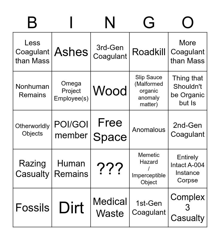 This bingo card has a free space and 24 words: Human Remains, Dirt, Wood, Fossils, More Coagulant than Mass, Less Coagulant than Mass, Nonhuman Remains, Ashes, Anomalous, ???, Slip Sauce (Malformed organic anomaly matter), Otherworldly Objects, Memetic Hazard / Imperceptible Object, Entirely Intact A-004 Instance Corpse, Omega Project Employee(s), 1st-Gen Coagulant, 2nd-Gen Coagulant, 3rd-Gen Coagulant, Thing that Shouldn't be Organic but Is, POI/GOI member, Complex 3 Casualty, Razing Casualty, Roadkill and Medical Waste.