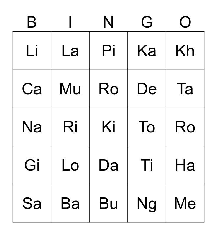This bingo card has 25 words: Gi, Ba, Ki, Ng, Kh, Li, La, Pi, To, Ha, Ca, Mu, Bu, Ti, Ta, Sa, Ri, Ro, De, Ro, Na, Lo, Da, Ka and Me.