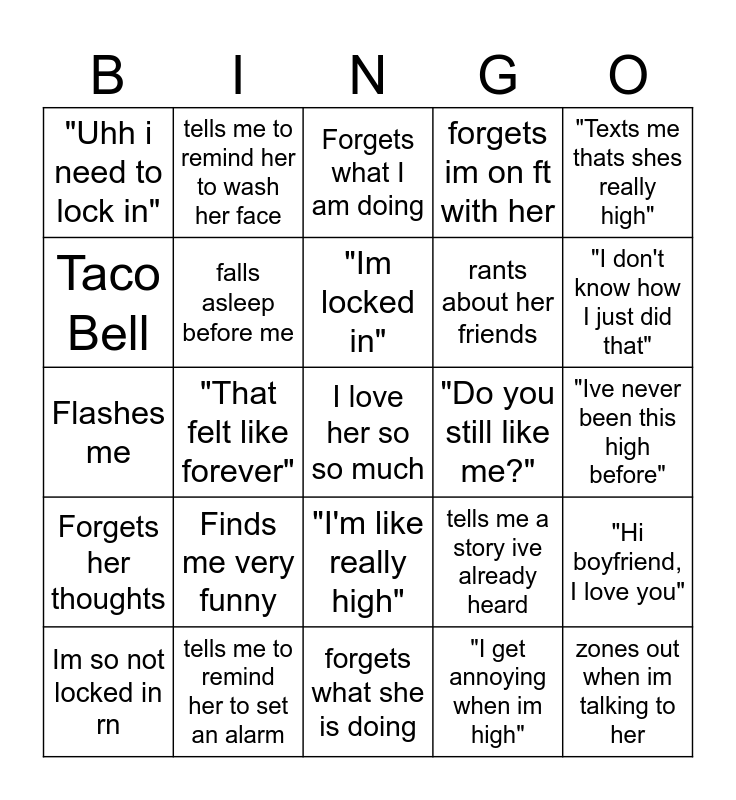 This bingo card has a free space and 24 words: Finds me very funny, tells me to remind her to set an alarm, "Im locked in", Im so not locked in rn, "Texts me thats shes really high", "Uhh i need to lock in", Taco Bell, tells me to remind her to wash her face, "Do you still like me?", "I'm like really high", rants about her friends, Flashes me, tells me a story ive already heard, "Hi boyfriend, I love you", falls asleep before me, "I get annoying when im high", "Ive never been this high before", Forgets what I am doing, "I don't know how I just did that", "That felt like forever", zones out when im talking to her, Forgets her thoughts, forgets im on ft with her and forgets what she is doing.
