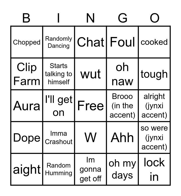 This bingo card has a free space and 24 words: aight, Imma Crashout, wut, oh my days, cooked, Chopped, Randomly Dancing, Chat, Brooo (in the accent), alright (jynxi accent), Aura, Starts talking to himself, Ahh, so were (jynxi accent), Clip Farm, Random Humming, Im gonna get off, Foul, tough, Dope, I'll get on, W, oh naw and lock in.